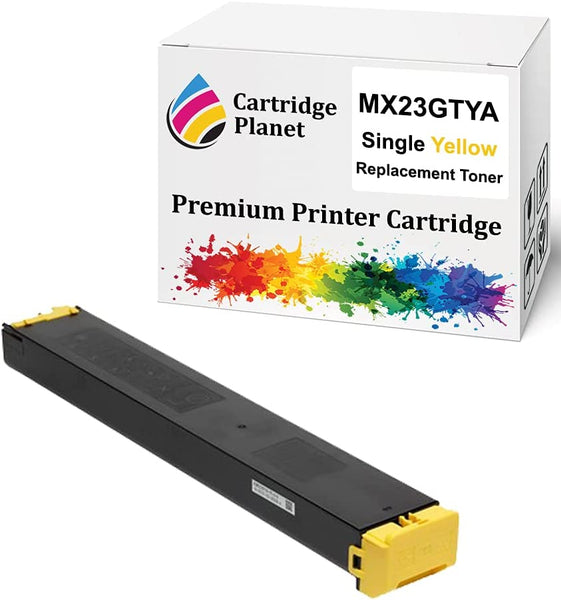Includes 1 of Yellow Compatible Toner Cartridge for Sharp MX-23GTYA MX23GTYA Approx. 10,000 pages at 5% coverage For use in printer: Sharp MX 2010U MX 2130U MX 2310U MX 2314N MX 2614N MX 3111U MX 3114N View more